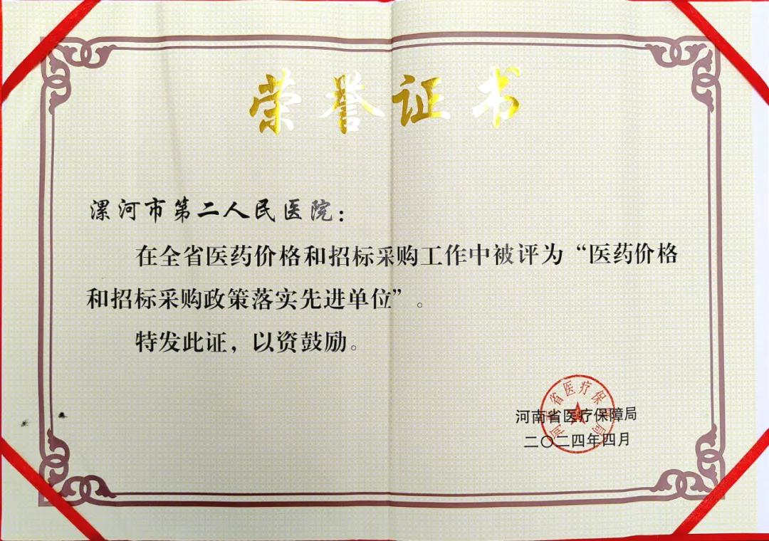 近日,市二院在全省醫(yī)藥價(jià)格和招標(biāo)采購(gòu)工作綜合評(píng)價(jià)中,被河南省醫(yī)療保障局評(píng)為“醫(yī)藥價(jià)格和招標(biāo)采購(gòu)政策落實(shí)先進(jìn)單位”。