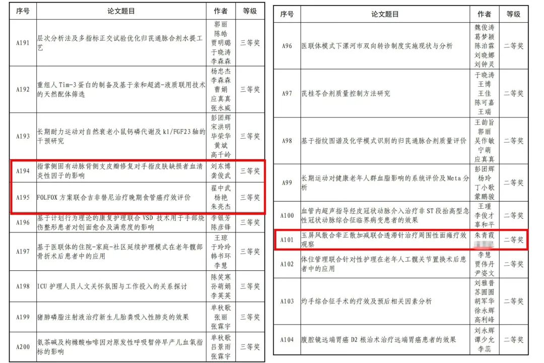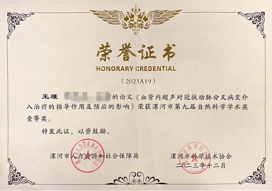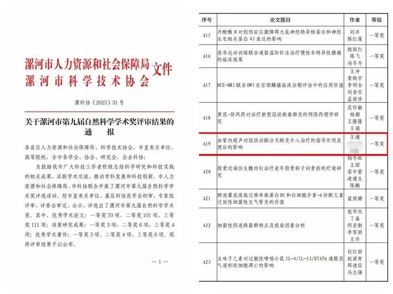 近日,漯河市人力資源和社會保障局、漯河市科學技術協(xié)會公布漯河市第九屆自然科學學術獎優(yōu)秀學術論文評選結果。市二院院長王瑾《血管內(nèi)超聲對冠狀動脈分叉病變介入治療的指導作用及預后的影響》、《血管內(nèi)超聲指導經(jīng)皮冠狀動脈介入治療非 ST 段抬高型急 性冠狀動脈綜合征臨界病變患者的效果》分別榮獲一等獎和二等獎;中醫(yī)針灸科主任朱青霞《玉屏風散合牽正散加減聯(lián)合透滯針治療周圍性面癱療效觀察》榮獲二等獎;腫瘤科副主任醫(yī)師翟中武《FOLFOX 方案聯(lián)合吉非替尼治療晚期食管癌療效評價》、顯微外科主治醫(yī)師劉東博的《指掌側固有動脈背側支皮瓣修復對手指皮膚缺損者血清炎性因子的影響》榮獲三等獎。