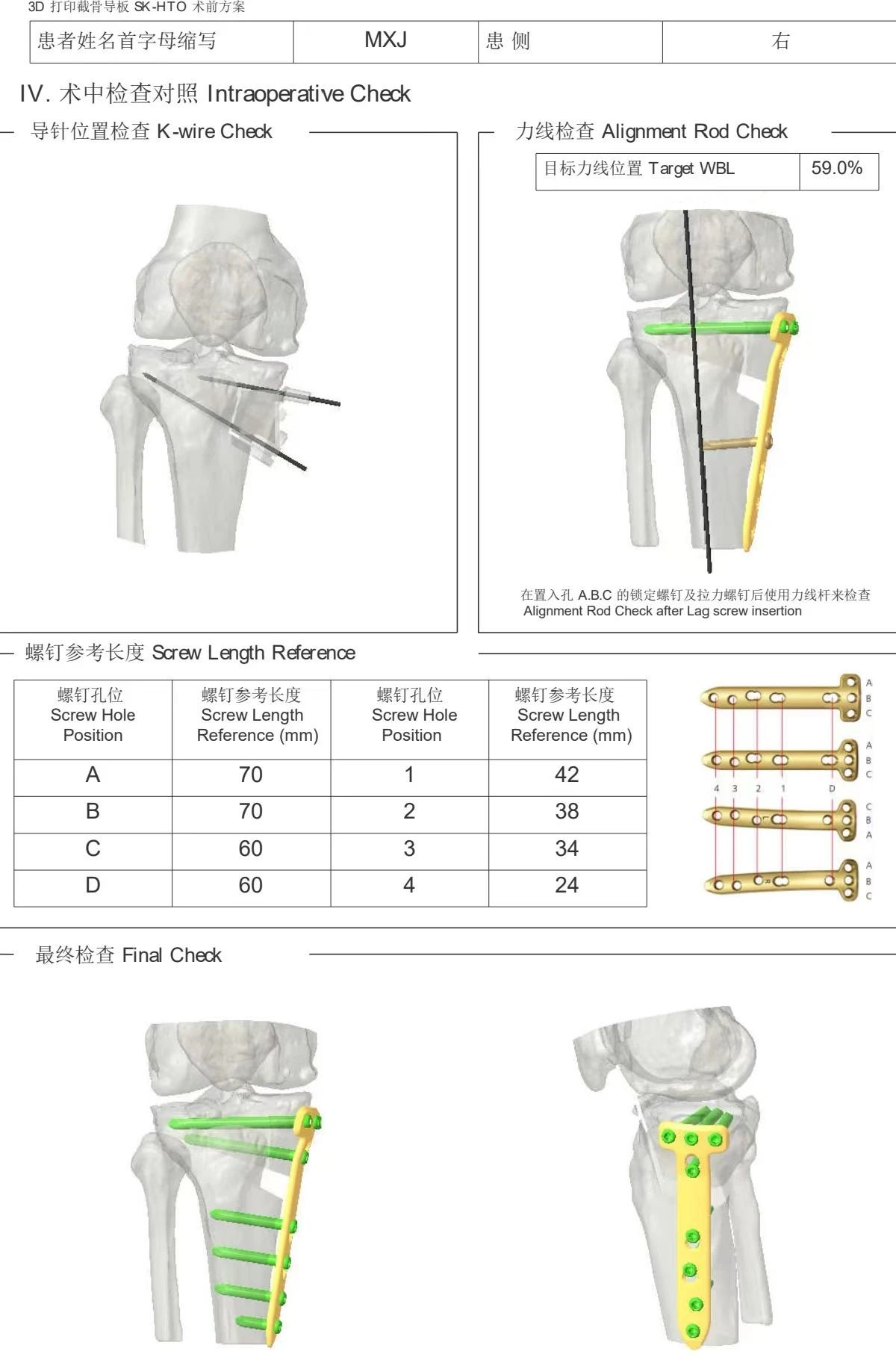 鋼板位置、螺釘位置及長(zhǎng)度均可通過(guò)術(shù)前規(guī)劃計(jì)算,術(shù)中通過(guò)定位操作,基本與術(shù)前規(guī)劃一致,手術(shù)快速高效完成,外側(cè)合頁(yè)保留完整。無(wú)任何并發(fā)癥出現(xiàn)。術(shù)后見(jiàn)鋼板位置及力線糾正近乎完美!