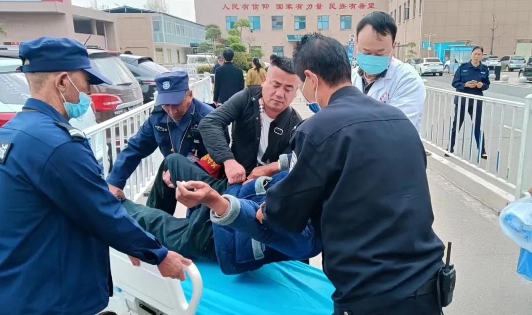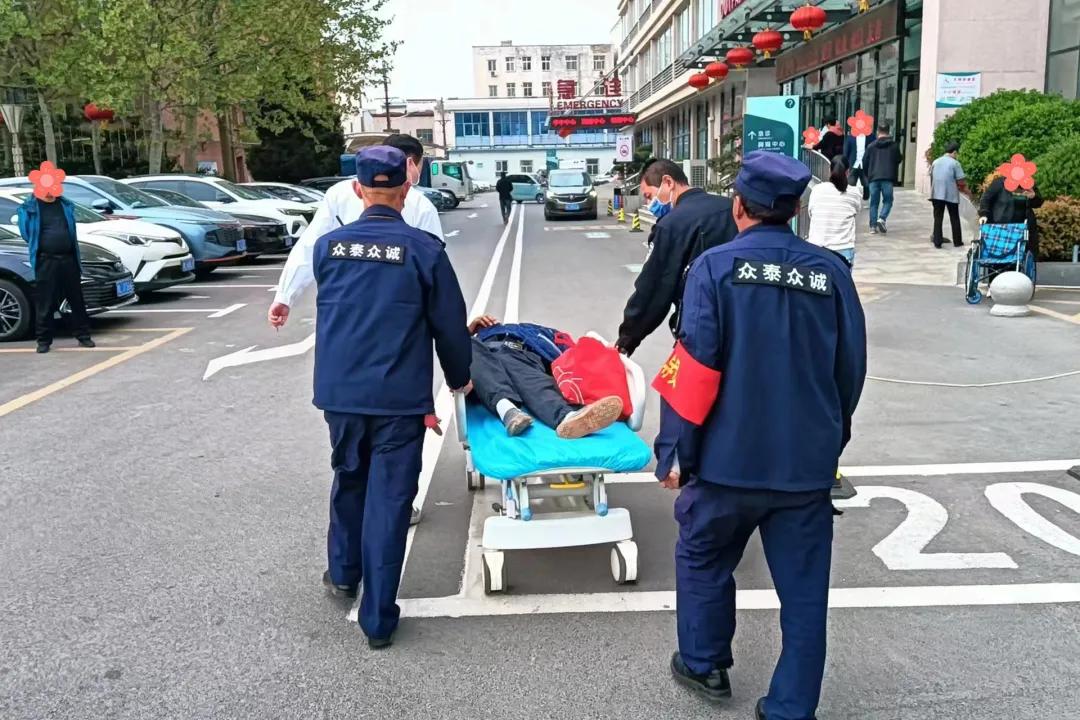班長王收首先利用醫(yī)院保衛(wèi)科“點對點”的安保設(shè)置,通知急診醫(yī)學(xué)科駐點的安保人員,及時與急診醫(yī)務(wù)人員取得聯(lián)系;同時,安保隊員李文超等人迅速趕到,幫助急診科住院醫(yī)師王英杰一起,將平車推往現(xiàn)場;聞訊趕來的賈俊杰隊長冷靜指揮,多名隊員合力將患者搬上了平車,并迅速轉(zhuǎn)移至急診搶救室。