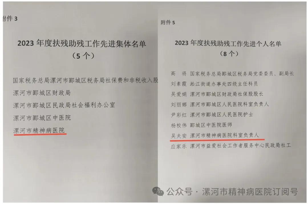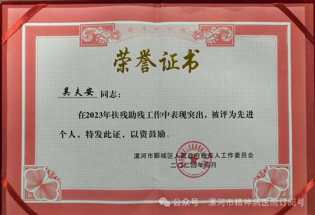 2024年4月24日上午,在漯河市郾城區(qū)殘聯(lián)“關(guān)于表彰2023年度全區(qū)殘疾人工作先進(jìn)集體和先進(jìn)個(gè)人”表彰會(huì)議中,漯河市精神病醫(yī)院獲得“2023年度扶殘助殘工作先進(jìn)集體”,吳夫安同志在2023年度扶殘助殘工作中表現(xiàn)突出被評(píng)為“先進(jìn)個(gè)人”榮譽(yù)稱號(hào)。