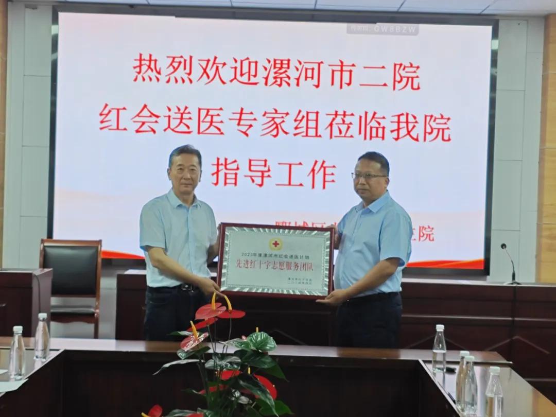 漯河市紅十字會(huì)黨組成員、副會(huì)長(zhǎng)劉國防,市二院副院長(zhǎng)張曉東,市二院工會(huì)主席李世學(xué),郾城區(qū)紅十字會(huì)副會(huì)長(zhǎng)李山峰,龍城鎮(zhèn)衛(wèi)生院相關(guān)負(fù)責(zé)同志出席了本次對(duì)接會(huì)議和義診活動(dòng)。對(duì)接會(huì)上,市紅會(huì)副會(huì)長(zhǎng)劉國防對(duì)市二院“紅會(huì)送醫(yī)計(jì)劃”所做的工作表示了高度的肯定,并向醫(yī)院頒發(fā)了2023年河南省“紅會(huì)送醫(yī)計(jì)劃”先進(jìn)單位、2023年漯河市“紅會(huì)送醫(yī)計(jì)劃”先進(jìn)單位兩塊獎(jiǎng)牌,對(duì)市二院李慧新等7名同志獲得省級(jí)和市級(jí)“優(yōu)秀紅十字醫(yī)療專家志愿者”稱號(hào)表示祝賀。