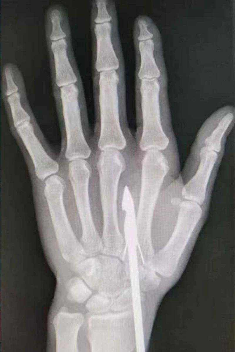 時間緊迫,每一秒的流逝都可能對傷者的手部功能造成不可逆的損害。接診醫(yī)生代彭威,迅速對傷者進行了初步檢查。他注意到,魚鉤已經(jīng)深深嵌入皮膚,情況遠比表面看起來復雜。沒有絲毫猶豫,立即安排了X線檢查以確認魚鉤的位置及傷及范圍,以及急診化驗檢查以評估患者的整體狀況。