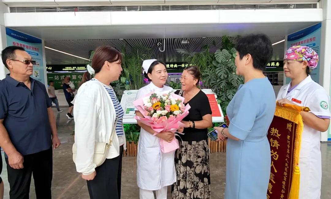 8月23日,來自鞏義的患者家屬一行四人攜鮮花、錦旗、禮品,驅(qū)車200公里到市二院,找到該院副院長(zhǎng)劉橋和重癥醫(yī)學(xué)科護(hù)士長(zhǎng)蔡新華直接表達(dá)來意:我們要給貴院重癥醫(yī)學(xué)科護(hù)士王美娜“送禮”,并希望院領(lǐng)導(dǎo)一定要好好表揚(yáng)她:“要是沒有她,我們都不敢想會(huì)有啥后果!”