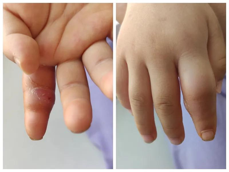 第三天開始,月月哭鬧不止,一直說手疼,怎么哄也不行,于是在當(dāng)?shù)蒯t(yī)院治療了10來天,然而月月的手指依然腫得像個胡蘿卜,疼痛感依然存在。此時,月月的媽媽才覺得事情不大對勁,于是經(jīng)過打聽,慕名來到市二院顯微外科。入院后,經(jīng)檢查發(fā)現(xiàn),月月的右食指骨質(zhì)有侵蝕,骨骺有缺損,甚至?xí)绊懸院笫种傅陌l(fā)育。聽到這個消息,月月媽媽感覺心都揪住了。