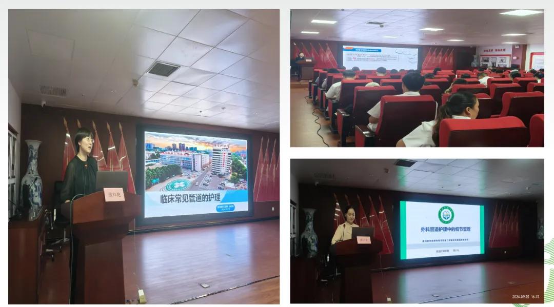 漯河市骨科醫(yī)院管道護理學(xué)組組長侯紅艷護士長通過PPT培訓(xùn)的方式對各類管道的固定方法、固定流程,標(biāo)識使用進行了詳細的講解,護士們加深了對管道規(guī)范固定重要性的認識,對規(guī)范臨床管道護理工作起到了良好的指導(dǎo)作用。婦產(chǎn)科護士長譚少允針對《外科管道護理中的細節(jié)管理》做了詳盡的說明??祻?fù)醫(yī)學(xué)科護士長田智慧分享了《血管導(dǎo)管相關(guān)感染預(yù)防與控制指南解讀》,預(yù)防血管內(nèi)導(dǎo)管相關(guān)血流感染的原因進行分析,并采取相關(guān)舉措后在臨床中獲取的成效和學(xué)員們分享經(jīng)驗。