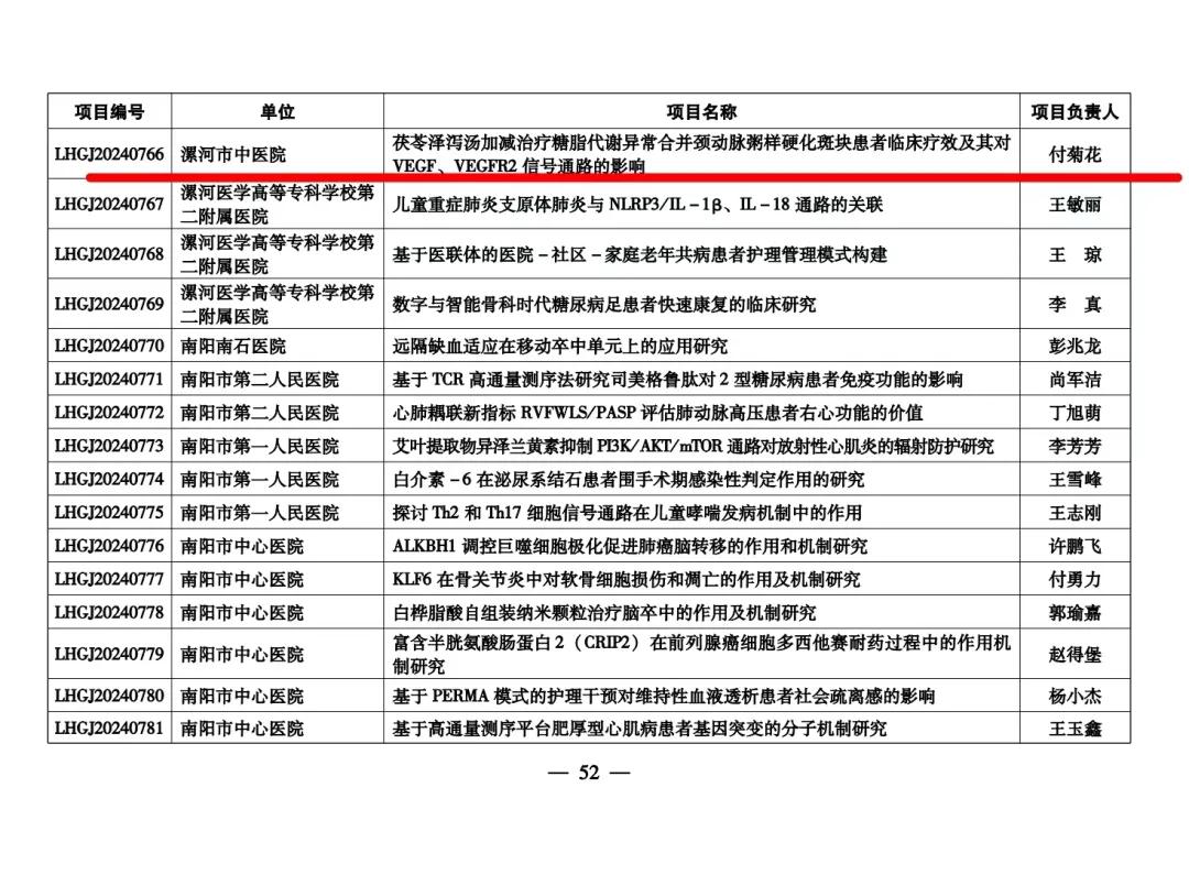 近日,河南省衛(wèi)健委發(fā)布了《關(guān)于印發(fā)2024年度河南省醫(yī)學科技攻關(guān)計劃聯(lián)合共建和軟科學項目立項名單的通知》,漯河市中醫(yī)院作為主持單位,共有1個項目獲得立項,此次為醫(yī)院在該類項目申報中首次獲得立項,這是繼醫(yī)院博士創(chuàng)新實踐基地獲批以來,科技研發(fā)的又一新突破。