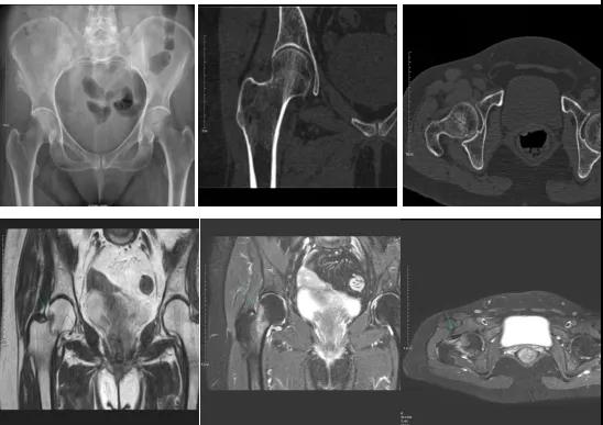 DR示:右側(cè)股骨頸未見明顯骨折征象。CT右側(cè)股骨頸骨質(zhì)密度不均?;颊唧w征明顯,為明確診斷,行MRI檢查。MRI示:右側(cè)股骨頸T1WI呈低信號,脂肪抑制序列呈高信號;提示右側(cè)股骨頸隱匿性骨折。