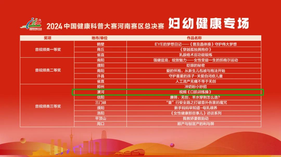 在大賽中,市二院憑借卓越表現(xiàn),原創(chuàng)作品《雙腿的控訴》獲得慢性病類作品三等獎、《背包俠客》獲得婦幼健康類作品三等獎、視頻作品《口肌訓練操》獲得三等獎,為健康知識普及書寫了精彩篇章。