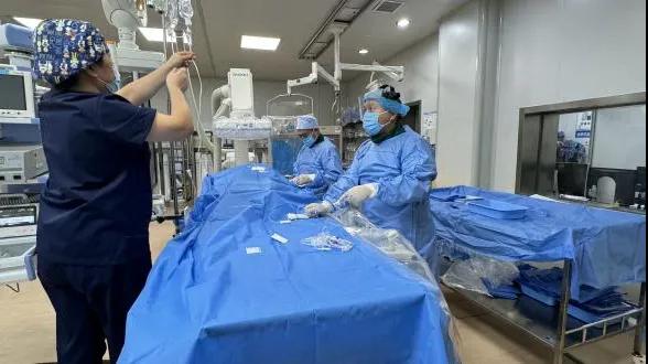 早9時,第一位患者順利進入導管室,血管開通后發(fā)現(xiàn)這是一名三支病變的患者——一改術前“備戰(zhàn)”時的輕松狀態(tài),此刻的介入手術室內“畫”風突變,醫(yī)護之間使用極簡練的詞語交流,彼此一個眼神就“秒懂”對方的意思,這份默契得益于長年累月的配合和并肩作戰(zhàn)。很快,第一臺手術順利結束。