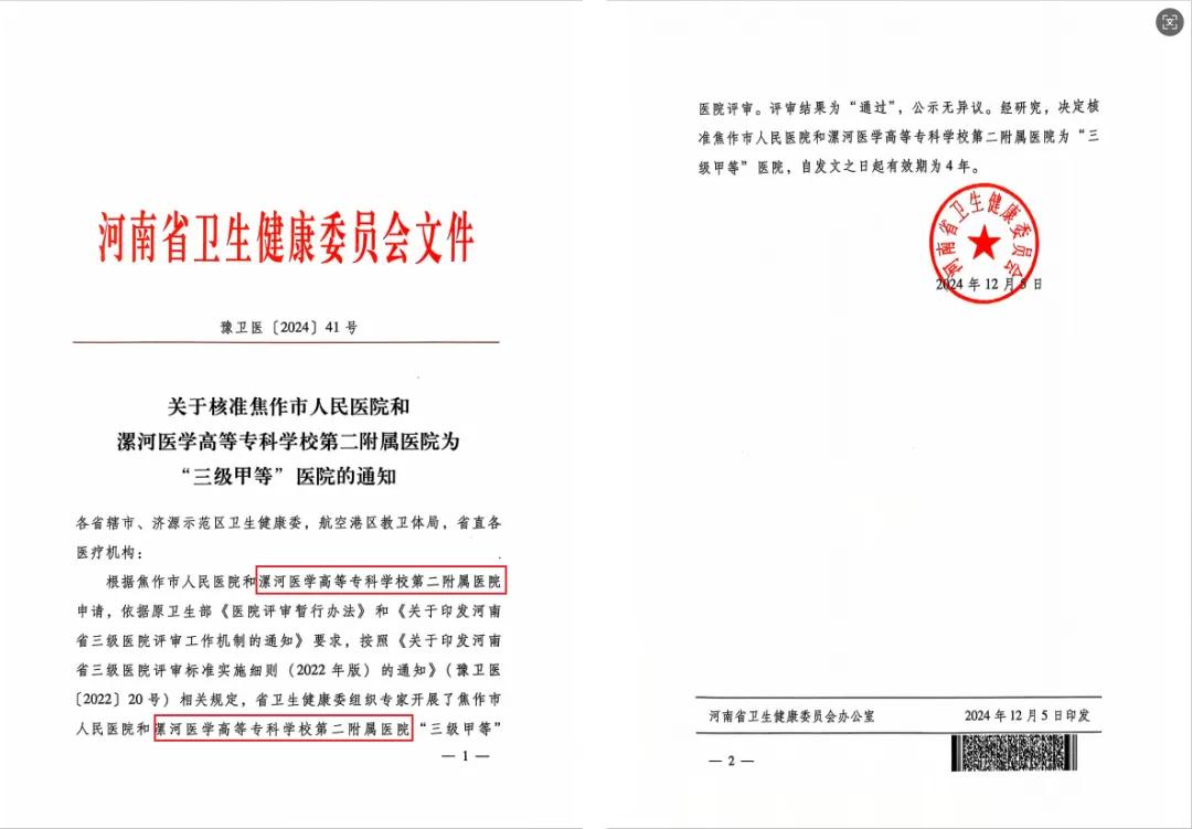從1949年到2024年,漯河醫(yī)專第二附屬醫(yī)院(漯河市骨科醫(yī)院、漯河市立醫(yī)院)走過了75載不平凡的發(fā)展歷程。時(shí)值醫(yī)院建院75周年之際,喜報(bào)傳來:經(jīng)河南省衛(wèi)生健康委“三級(jí)甲等醫(yī)院”評(píng)審和公示,決定核準(zhǔn)漯河醫(yī)學(xué)高等??茖W(xué)校第二附屬醫(yī)院為“三級(jí)甲等”醫(yī)院!
