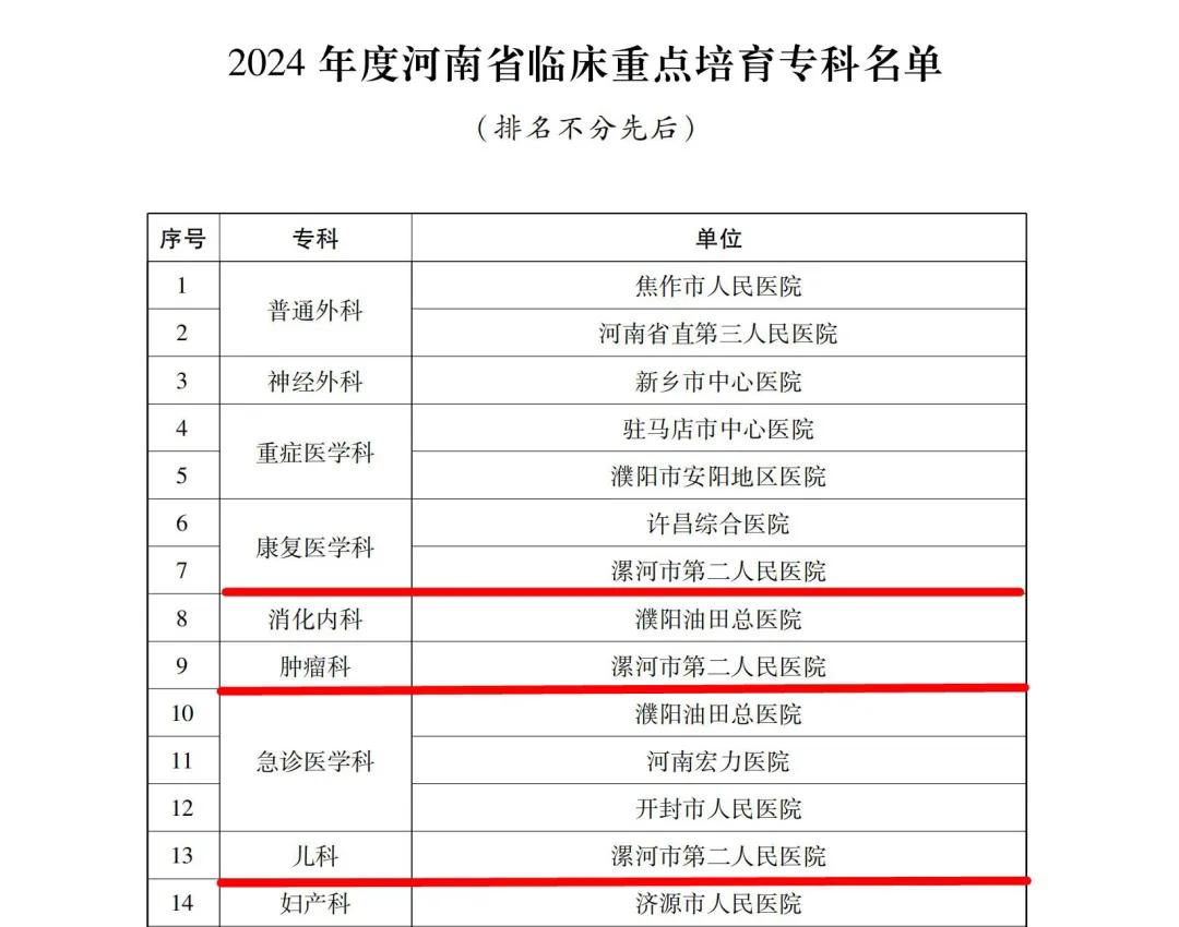 12月24日,河南省衛(wèi)生健康委下發(fā)了《關(guān)于公布2024年度河南省臨床重點專科及特色??泼麊蔚耐ㄖ罚ㄔバl(wèi)醫(yī)〔2024〕45號)。市二院兒科、腫瘤科(腫瘤放療科、腫瘤內(nèi)科)、康復(fù)醫(yī)學(xué)科成功通過評審,被確定為河南省臨床重點培育專科。