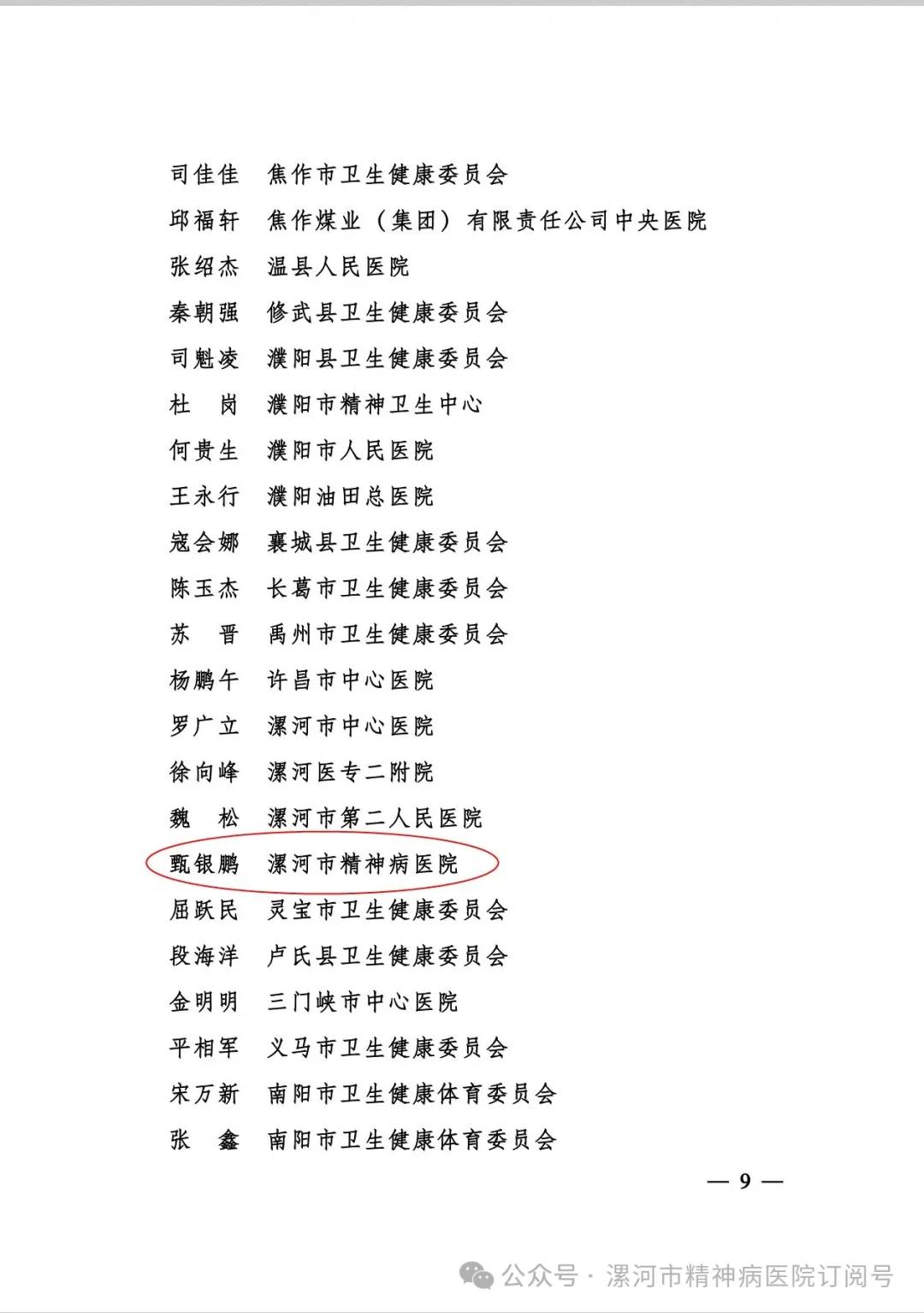 近日河南省健康委員會關(guān)于表揚(yáng)2024年度全省醫(yī)政和護(hù)理工作表現(xiàn)突出集體和個人的通報中,漯河市精神病醫(yī)院醫(yī)務(wù)科科長甄銀鵬榮獲“全省醫(yī)政工作表現(xiàn)突出個人”
