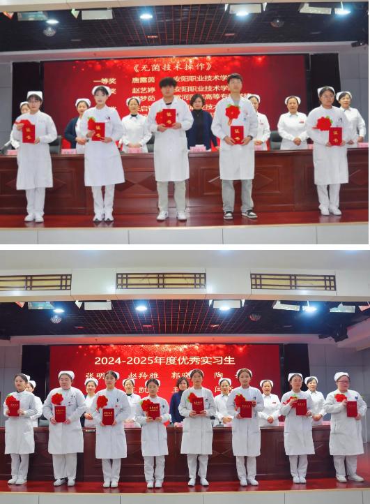 外一科護士長郭書娟、血液腫瘤科護士長袁菲分別宣讀了關(guān)于表彰技能操作競賽獲獎人員和優(yōu)秀實習生名單。隨后,對陶媛等12名護理實習生技能操作競賽獲獎人員及在2024-2025年度護理實習工作中涌現(xiàn)出的張明怡等8名優(yōu)秀實習生頒發(fā)了榮譽證書。