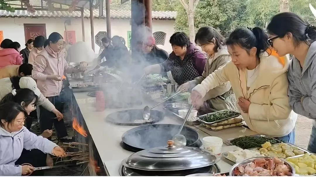 傍晚時(shí)分,炊煙裊裊。女職工們圍爐執(zhí)鏟,分組協(xié)作烹制自助地鍋,分工堪比手術(shù)室配合:有人專業(yè)控火如醫(yī)囑級(jí)“文火轉(zhuǎn)中火”,有人顛勺翻炒展現(xiàn)“無菌操作”式利落。柴火灶前翻炒聲、歡笑聲交織成趣。此刻,沒有無影燈與監(jiān)護(hù)儀,只有星辰煙火映笑顏。
