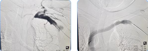 腎內科接診醫(yī)生對其進行查體后,判斷其中心靜脈存在問題,建議進行手術治療。在完善術前檢查后,腎內科團隊的成功對患者實施了左側無名靜脈覆膜支架置入術。此次手術歷時1小時,在DSA(數字減影血管造影)引導下成功于患者左側無名靜脈閉塞處植入支架,術后患者上肢腫脹癥狀即刻緩解,次日即恢復正常透析。