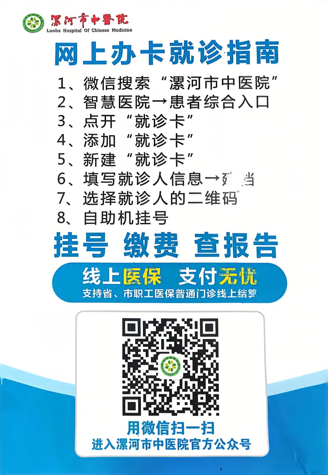 2、預(yù)約掛號(hào):子女或親屬可幫助老年人通過(guò)醫(yī)院微信公眾號(hào)(如“漯河市中醫(yī)院公眾號(hào)”)或者支付寶小程序線上預(yù)約掛號(hào)。