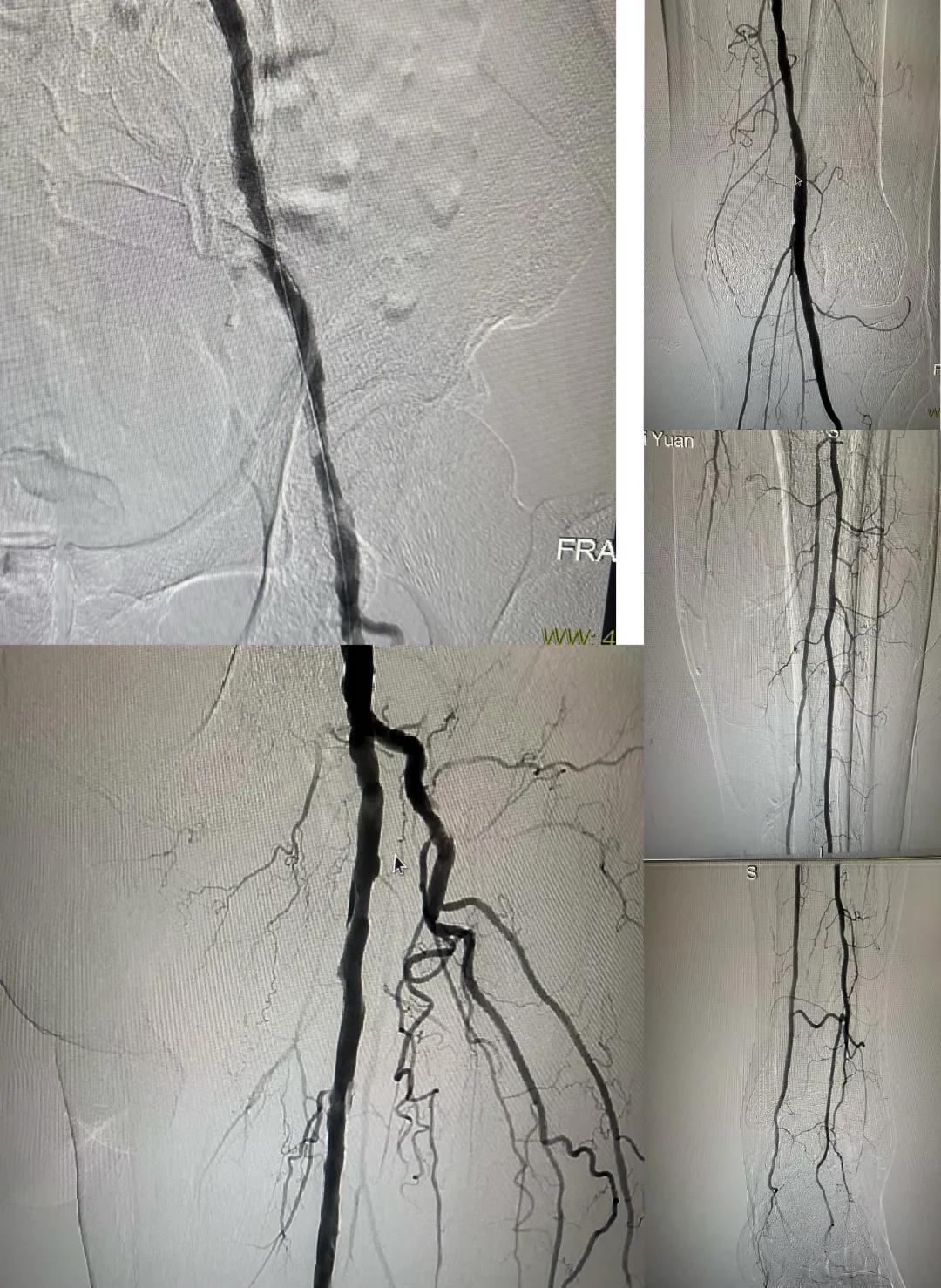 患者,男,73歲,約15天前出現(xiàn)左側(cè)腳面腫痛,間歇性跛行,左足第三足趾壞疽,遂來市中醫(yī)院就診,以“下肢動脈硬化閉塞、糖尿病足壞疽、”收住外二科,評估患者病情后需實施左下肢球囊擴張成形術。術中造影見患者左側(cè)髂動脈、股淺動脈階段性重度狹窄。經(jīng)外周球囊擴張術后,再次造影見股淺動脈、髂動脈血流通暢,膝下及足部血流速度較前改善。