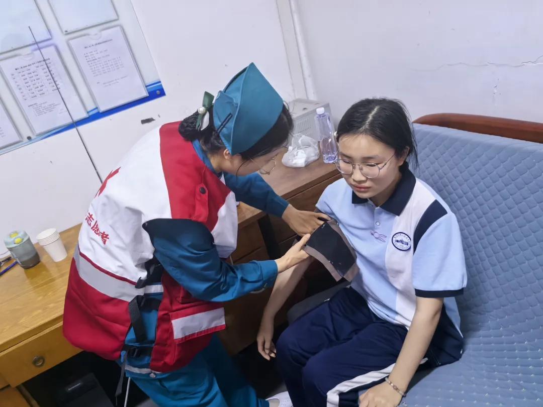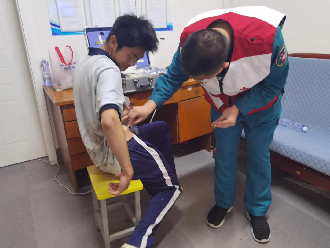 運動會期間,志愿者穿梭于賽場的各個角落,化身“移動急救站”,時刻關注著運動員的狀態(tài)。一旦接到求助,他們迅速到達現(xiàn)場,對傷員進行初步診斷和處理,為擦傷運動員細心消毒包扎,為身體不適學生及時測量血壓、補充電解質(zhì)飲品。面對突發(fā)扭傷學生,志愿者第一時間進行專業(yè)評估與固定處理,贏得師生一致好評。