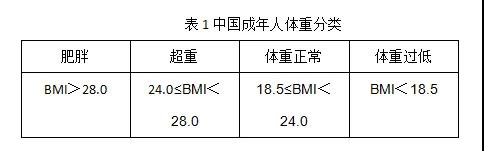體重變化是判斷一段時期內(nèi)能量平衡與否最簡便易行的指標,也是判斷吃動是否平衡的指標。目前常用的判斷健康體重的指標是體質(zhì)指數(shù)(body massindex, BMI),它的計算方法是用體重(kg)除以身高(m)的平方。我國健康成年人(18~64歲)的BMI應(yīng)在18.5~23.9 kg/m2(表1),65歲以上老年人的適宜體重和 BMI應(yīng)該略高(20~26.9kg/m2)。