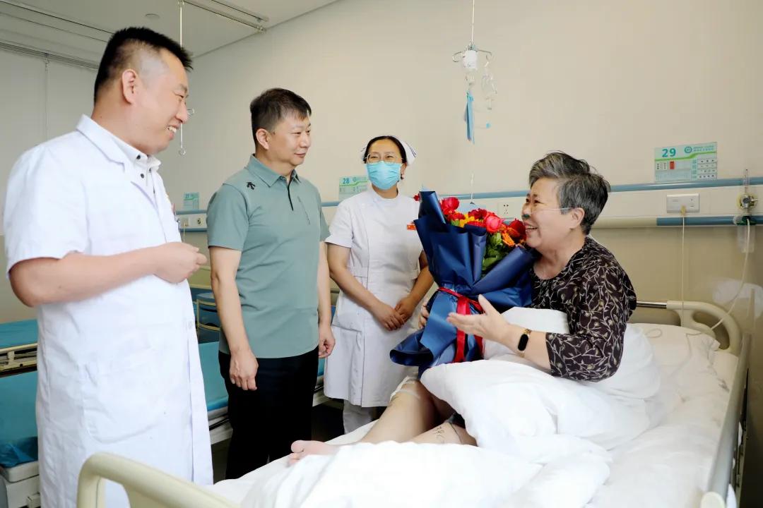 5月30日上午,市二院黨委書記魏松、副院長劉橋?qū)3虂淼讲》?,看望慰問這位康復(fù)中的香港同胞,送上代表健康祝愿的鮮花,關(guān)切詢問其身體恢復(fù)情況,并送上端午安康的祝福。“沒想到在異鄉(xiāng)生病,還能在節(jié)日收到這么溫暖的關(guān)懷,真的太感謝大家了!是二院優(yōu)秀的醫(yī)護團隊救了我的命,我們?nèi)叶几屑げ槐M!感謝二院!感謝漯河!”翁阿姨激動地表示,醫(yī)院高效的救治與貼心的服務(wù),讓他感受到了重生的喜悅和家一般的溫暖。