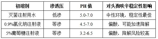 溶媒的pH是影響藥物溶解的關(guān)鍵因素。頭孢呋辛鈉是β-內(nèi)酰胺類抗生素,pH為6.0-8.0。此類藥物易受H+或OH-的催化而降解,因此頭孢呋辛鈉在水溶液中的降解速率與溶液pH值有關(guān)。頭孢呋辛鈉在中性環(huán)境(pH 6.0-8.0)最穩(wěn)定。滅菌注射用水的pH(5.0-7.0)接近中性,而生理鹽水pH(4.5-7.0)和葡萄糖注射液pH(3.2-6.5)可能偏酸,加速藥物水解,生成黃色降解產(chǎn)物(如7位側(cè)鏈衍生物),降低藥效。