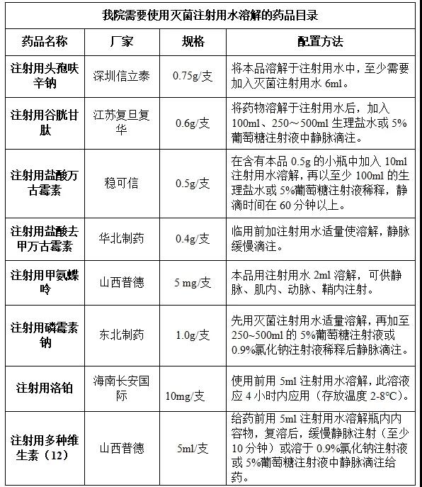 現(xiàn)對(duì)我院常用需使用滅菌注射用水初溶的藥品及配置細(xì)節(jié)整理如下: