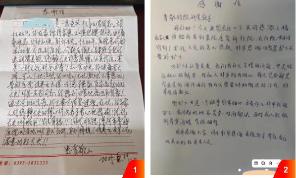 另一封感謝信來(lái)自因腰疼住院的患者,信中感謝了護(hù)士長(zhǎng)田智慧和護(hù)士曹玲。治療期間,兩位護(hù)理人員將專業(yè)、細(xì)致的服務(wù)貫穿始終。從日常康復(fù)護(hù)理操作到患者心理疏導(dǎo),她們始終保持高度的責(zé)任心,耐心解答疑問、貼心安撫情緒,用暖心服務(wù)助力患者身心康復(fù),贏得患者由衷的信賴與感激。