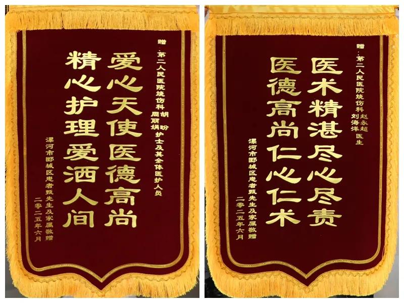 住院的日子里,每一天都讓患者感受到溫暖,每一名醫(yī)生,每一名護(hù)士,都讓他難忘。在出院時(shí),患者及家屬激動(dòng)不已:“沒(méi)想到我會(huì)恢復(fù)這么快,感謝你們的精湛醫(yī)術(shù),是你們給了我第二次生命!”為表示感謝,患者特地囑托身在外地的兒子定制了兩面錦旗,送至科室醫(yī)護(hù)手中。