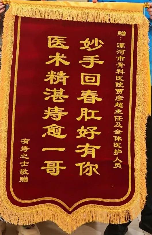近日,漯河醫(yī)專二附院(漯河市骨科醫(yī)院、漯河市立醫(yī)院)肛腸科收到一面滿載心意的錦旗?;颊呶罩Z彥超主任的手再三致謝,錦旗上“妙手回春肛好有你,醫(yī)術(shù)精湛痔愈一哥”十六個大字,既是對醫(yī)護(hù)人員專業(yè)能力的肯定,更是對肛腸科中西醫(yī)結(jié)合診療水平的認(rèn)可。