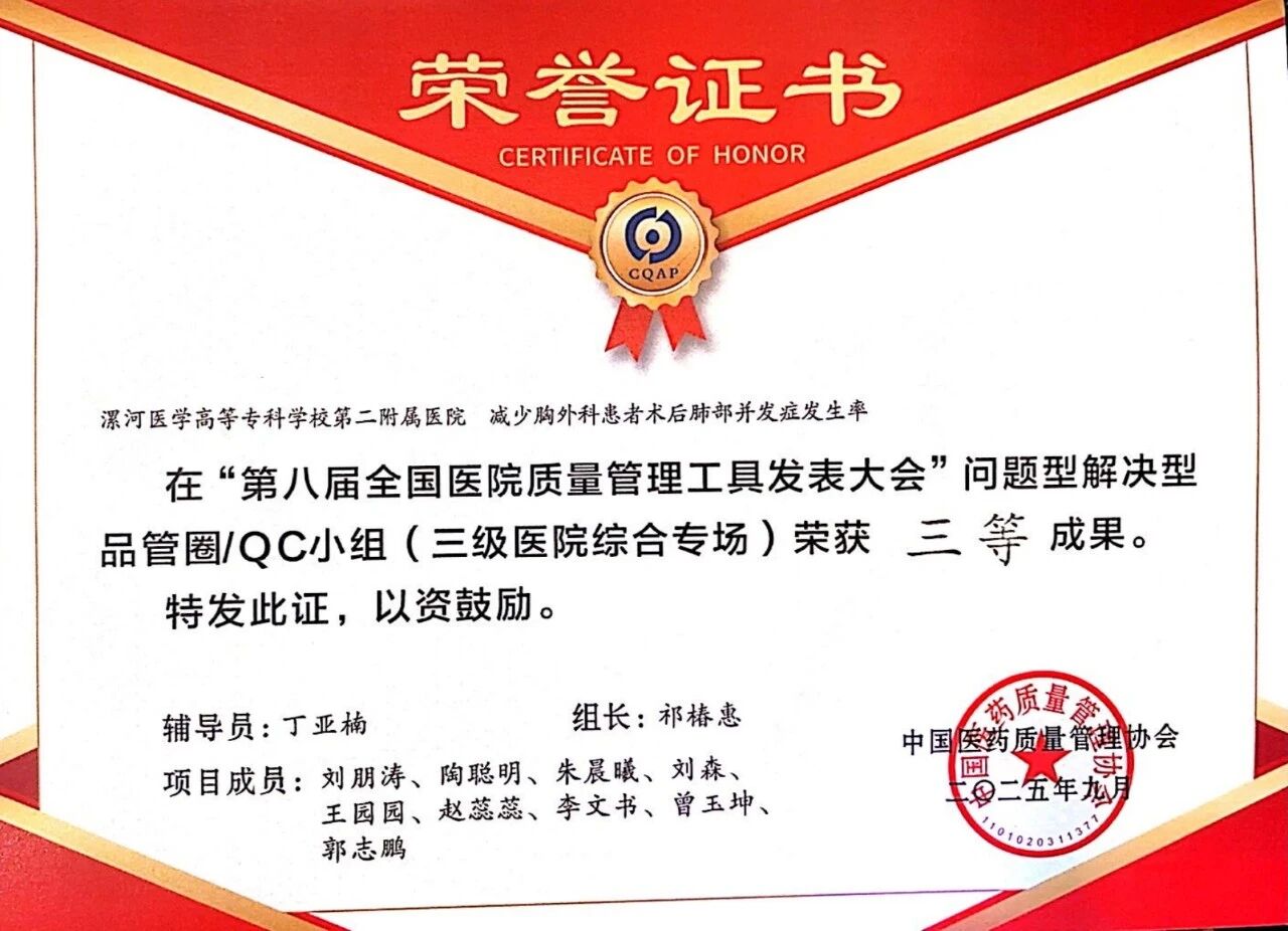 近日,第八屆醫(yī)院質(zhì)量管理工具應(yīng)用成果發(fā)表大會在重慶落幕。此次大賽共有來自全國的600多項(xiàng)課題參賽,其中413個項(xiàng)目入圍決賽,競爭激烈。 漯河醫(yī)專二附院(漯河市骨科醫(yī)院、漯河市立醫(yī)院)關(guān)節(jié)外科選送的RCA項(xiàng)目與胸外科選送的"非常好圈"品管圈項(xiàng)目,在各自專場中展現(xiàn)了扎實(shí)的專業(yè)素養(yǎng),最終在眾多優(yōu)秀團(tuán)隊中勝出,分別斬獲二等獎和三等獎。