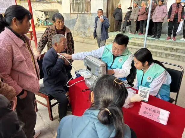 活動現場,漯河醫(yī)專二附院各科醫(yī)療專家志愿者熟練操作便攜式診療設備,有序的為當地村民免費測量血壓、手指血糖、甲狀腺彩超、骨密度檢測、眼底篩查、體格檢查、用藥指導、健康咨詢、疾病診斷等。面對前來就診的群眾,專家們耐心傾聽村民的病情描述,細致詢問既往病史、用藥情況,結合專業(yè)檢查給出精準診斷,同時圍繞常見慢性病管理、冬季傳染病預防、合理用藥等知識,發(fā)放宣傳手冊,用通俗易懂的語言為村民答疑解惑。