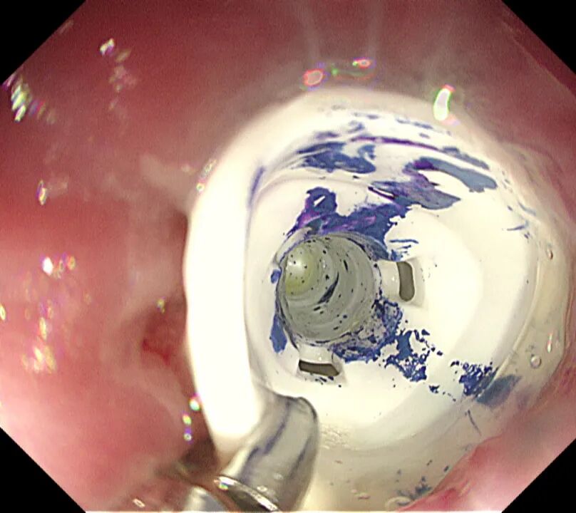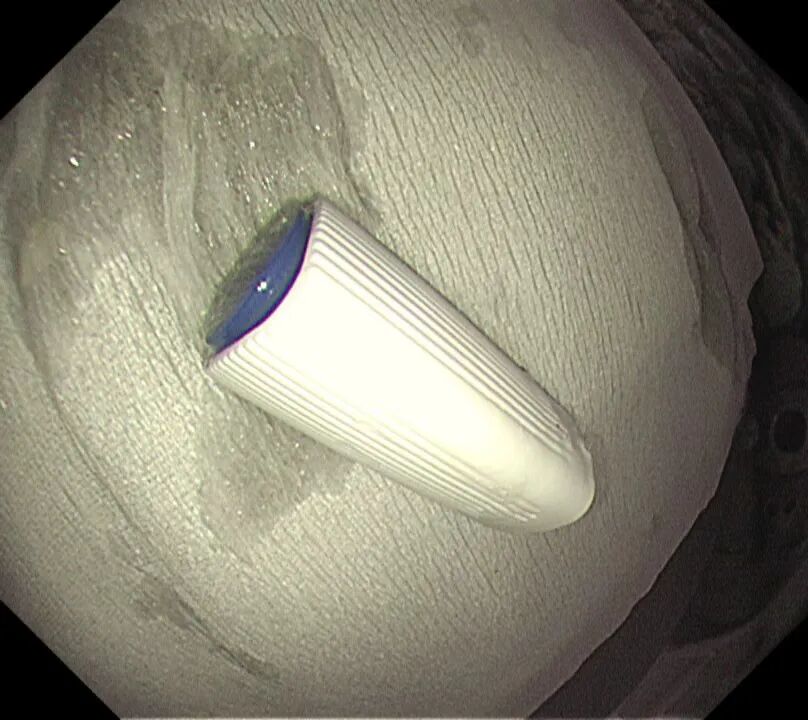 時(shí)間不等人,雖已臨近晚7點(diǎn),市二院第一時(shí)間啟動(dòng)應(yīng)急響應(yīng)機(jī)制,內(nèi)鏡室、麻醉科醫(yī)護(hù)技立即返崗就位,并經(jīng)院辦等職能部門積極協(xié)調(diào),盡可能縮短術(shù)前準(zhǔn)備時(shí)間,迅速制定了取出異物的方案。隨后,在全身麻醉下,朗朗安然入睡,醫(yī)生通過纖細(xì)的胃鏡,精準(zhǔn)地找到了那個(gè)“惹事”的筆帽位于十二指腸內(nèi),并順利將其取出。整個(gè)過程僅用時(shí)十幾分鐘,朗朗術(shù)后很快蘇醒,觀察無(wú)礙后平安回家。