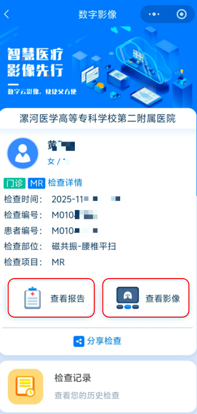 03 登錄患者影像檢查查詢頁后,可以點(diǎn)擊“查看報(bào)告”和“查看影像”來查看患者的影像報(bào)告和影像圖像。