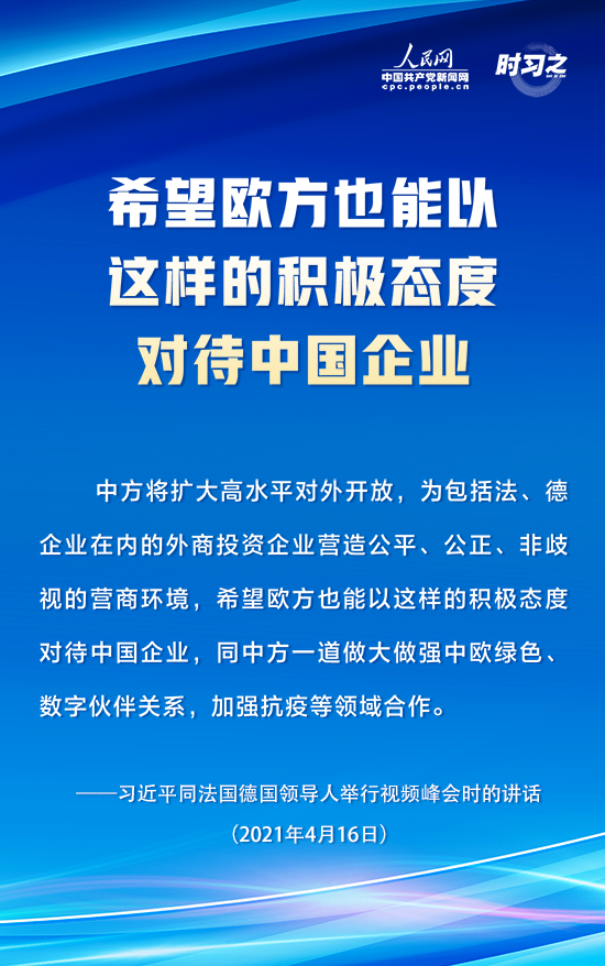 4月16日下午,國家主席習(xí)近平在北京同法國總統(tǒng)馬克龍、德國總理默克爾舉行中法德領(lǐng)導(dǎo)人視頻峰會(huì)。三國領(lǐng)導(dǎo)人就合作應(yīng)對(duì)氣候變化、中歐關(guān)系、抗疫合作以及重大國際和地區(qū)問題深入交換意見。人民網(wǎng)·中國共產(chǎn)黨新聞網(wǎng)“時(shí)習(xí)之”欄目摘錄了習(xí)近平在這次視頻峰會(huì)上的重要講話內(nèi)容,一起學(xué)習(xí)。