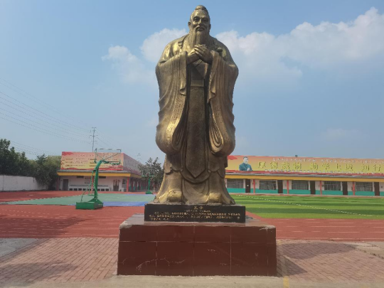 孔子巨大的木雕塑像,以“仁義禮智信”的姿態(tài)歡迎我們。兩側(cè)的敬老愛(ài)幼的典故雕像,以及習(xí)近平總書(shū)記的金句摘錄、歷代先賢的勵(lì)志名言,構(gòu)成了一個(gè)別具意味的氛圍。