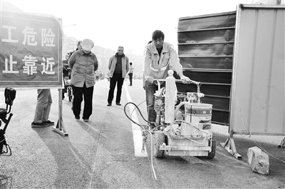 工作人員施劃交通標(biāo)線。記者 齊 放 攝