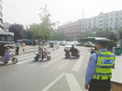 在市區(qū)大學(xué)路與嵩山路交叉口,一位輔警正在用執(zhí)法記錄儀記錄機(jī)動車禮讓斑馬線情況。記者 楊 旭 攝