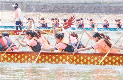 上午10點(diǎn)半,比賽正式開始,一條條龍舟在鼓聲中如離弦之箭,向終點(diǎn)駛?cè)?。選手們齊心協(xié)力,動(dòng)作整齊劃一,水面上槳板翻飛。一條條龍舟如同一條條游龍?jiān)隈Y騁,令現(xiàn)場(chǎng)觀眾群情激奮。