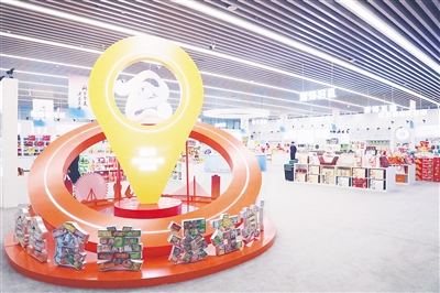中國(guó)食品名城品牌館食品展廳,本地休閑食品整齊陳列。