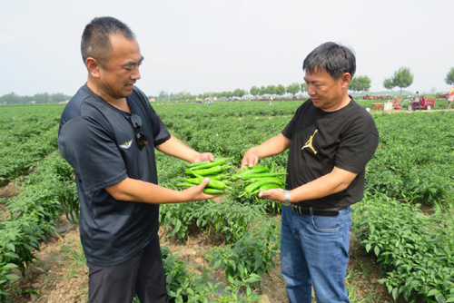 圖為石拐村黨支部書記、臨潁縣自安種植專業(yè)合作社負責人邢自安(右)石拐村第一書記張釗(左)在辣椒基地查看今年的辣椒長勢、辣椒品質時的情景。