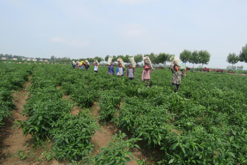 圖為臨潁縣王孟鎮(zhèn)石拐村自安產業(yè)扶貧基地的社員們,在辣椒基地采摘辣椒時的情景。