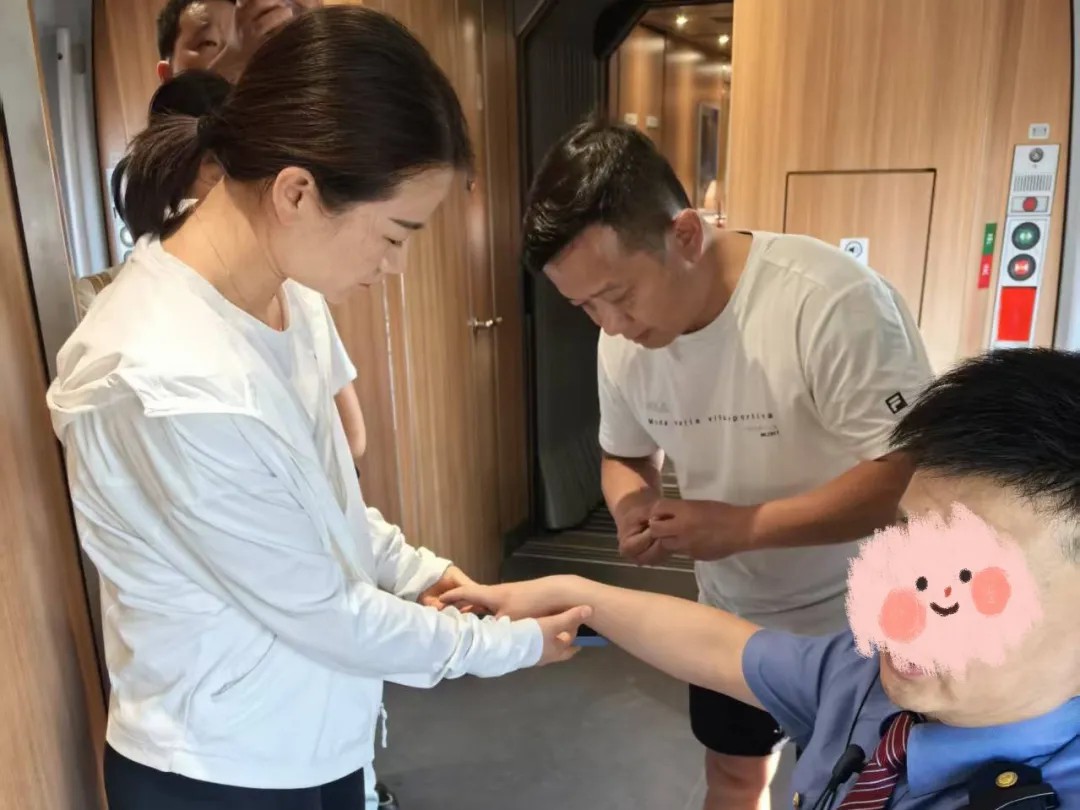 抵達(dá)現(xiàn)場,他們發(fā)現(xiàn)一名身著列車員制服的男性工作人員面色慘白、冷汗淋漓,因腰部劇痛蜷縮并呻吟。憑借豐富經(jīng)驗,兩人判斷其可能是腎結(jié)石引發(fā)的腎絞痛。在列車工作人員協(xié)助下,潘建濤施展中醫(yī)針灸,李璐同步監(jiān)測生命體征、安撫患者。經(jīng)救治,患者疼痛明顯減輕。他們向列車方交代后續(xù)注意事項后默默返回座位。