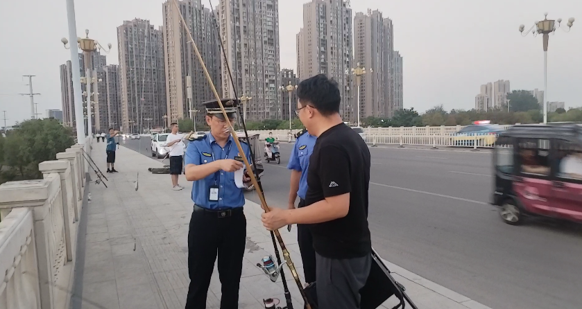 城管隊(duì)員對占用橋面違規(guī)釣魚者進(jìn)行勸導(dǎo)