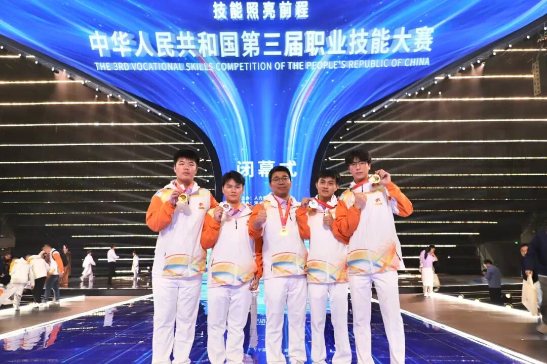 中華人民共和國第三屆職業(yè)技能大賽閉幕式上,自主移動機器人(世賽選拔項目)金牌獲得者楊奇瑞、介明鑫,工業(yè)視覺系統(tǒng)運維(國賽精選項目)金牌獲得者王華磊,機器人系統(tǒng)集成(世賽選拔項目)銀牌獲得者彎有道、王永康上臺領(lǐng)獎。