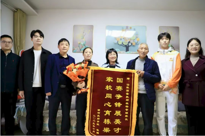 抵達選手家中后,院領(lǐng)導(dǎo)首先向家長和選手遞上紅彤彤的錦旗與沉甸甸的慰問品,“孩子能站上全國賽場拿獎牌,離不開家里的支持,也離不開學(xué)校的培養(yǎng),這是咱們共同的驕傲!”一句真摯祝賀,瞬間拉近了家校距離。