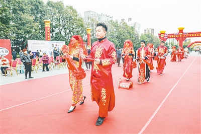 當天上午10時許,在婚禮現(xiàn)場,端莊秀麗的新娘們等待著意中人;新郎們?yōu)t灑大方,期待抱得美人歸。吉時已到,中式婚禮開始,先是傳統(tǒng)的大鼓、舞獅表演,接著是新娘入場、新婿登場,然后是迎新娘、入華堂、拜天地、交換定情信物、夫妻對拜、合影等活動流程。