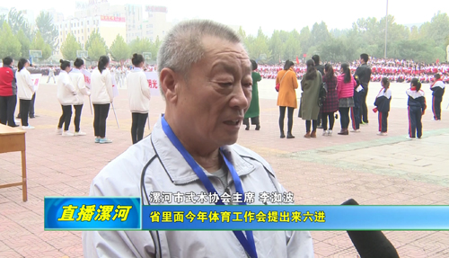 漯河市武術協(xié)會主席李洳波:國家對武術、包括體育這方面都非常重視,省里面今年提出來六進,武術進校園放的比較靠前,所以咱漯河既然是國家級非物質文化遺產(chǎn)項,所以說武術進校園是咱必須要做到的一個,因為它不但要培養(yǎng)下一代,而且要把漯河的延續(xù)了幾百年的武術文化,咱要給它發(fā)揚光大。