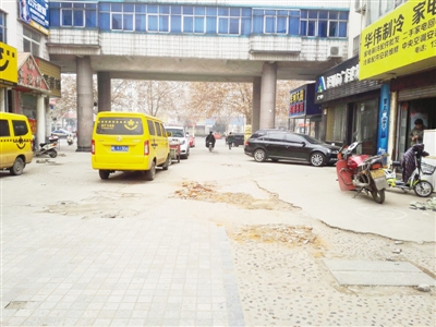 12月12日上午,記者在華山美食城看到,這里的路面鋪著地磚,但是一些地方已經(jīng)破損。特別是出口處的地面上有一些大坑,雖被商戶用碎磚石填上了,但車輛走在上面顛簸得很厲害。一些店鋪門前用水泥重新鋪平,但比正常路面高出不少。