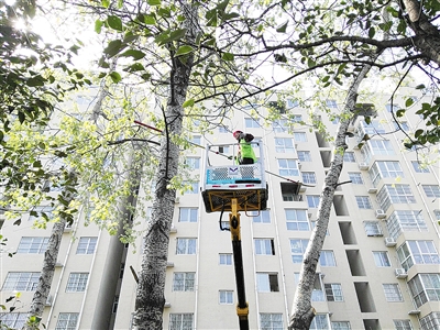 園林工人們正在修剪楊樹枝,以此來減少楊花的成孢率,減少飛絮。